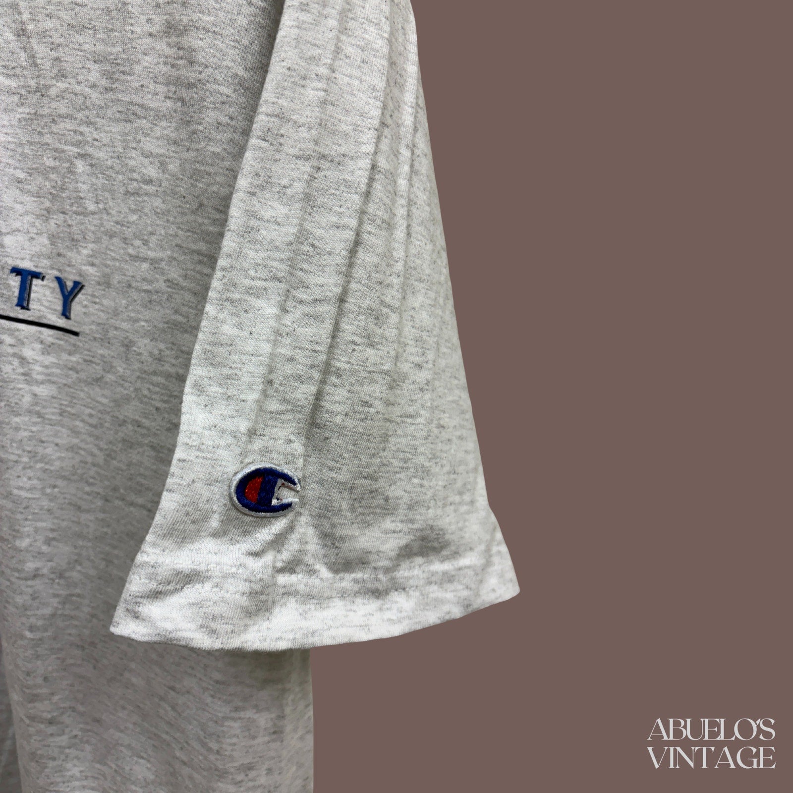 Vintage Champion Tufts University Alumni tee in classic heather gray. Features bold navy collegiate graphic with university seal and embroidered Champion “C” logo on the sleeve. Soft cotton blend with that true 90s campus bookstore feel.