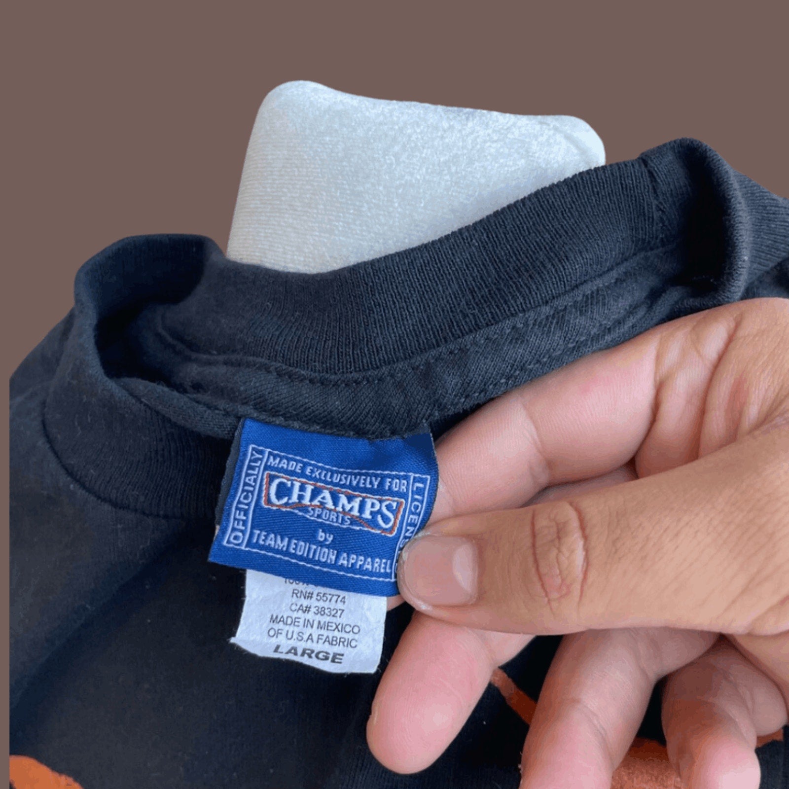 Channel Texas pride in this 90s/2000s Champs Sports graphic tee, featuring bold burnt orange “TEXAS Longhorns” print on jet black cotton. Made in Mexico from U.S. fabric, it’s pre-shrunk and built to last. Perfect for tailgates, campus fits, or collectors of classic Southern sportswear.