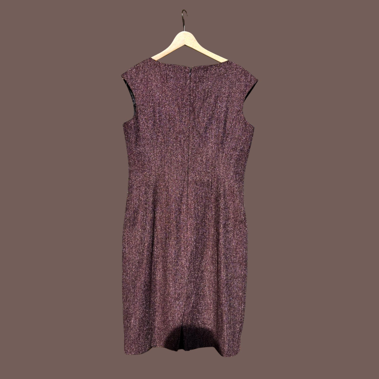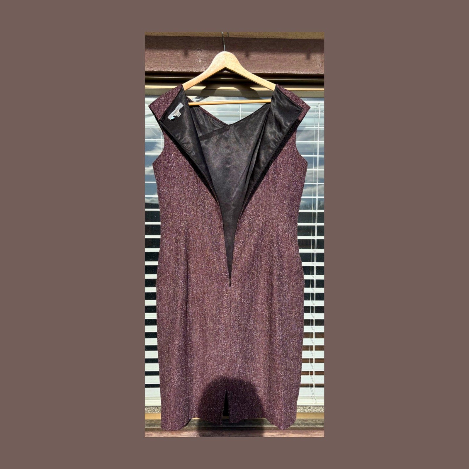 Chic with a twist. This Classiques Entier sheath dress is crafted from a luxe wool-viscose blend in a rich plum tweed, featuring a sculptural asymmetrical ruffle neckline. Fully lined with light stretch for structure and movement. A fitted silhouette with hidden back zip and small back slit. ✧ the HR-approved slay
