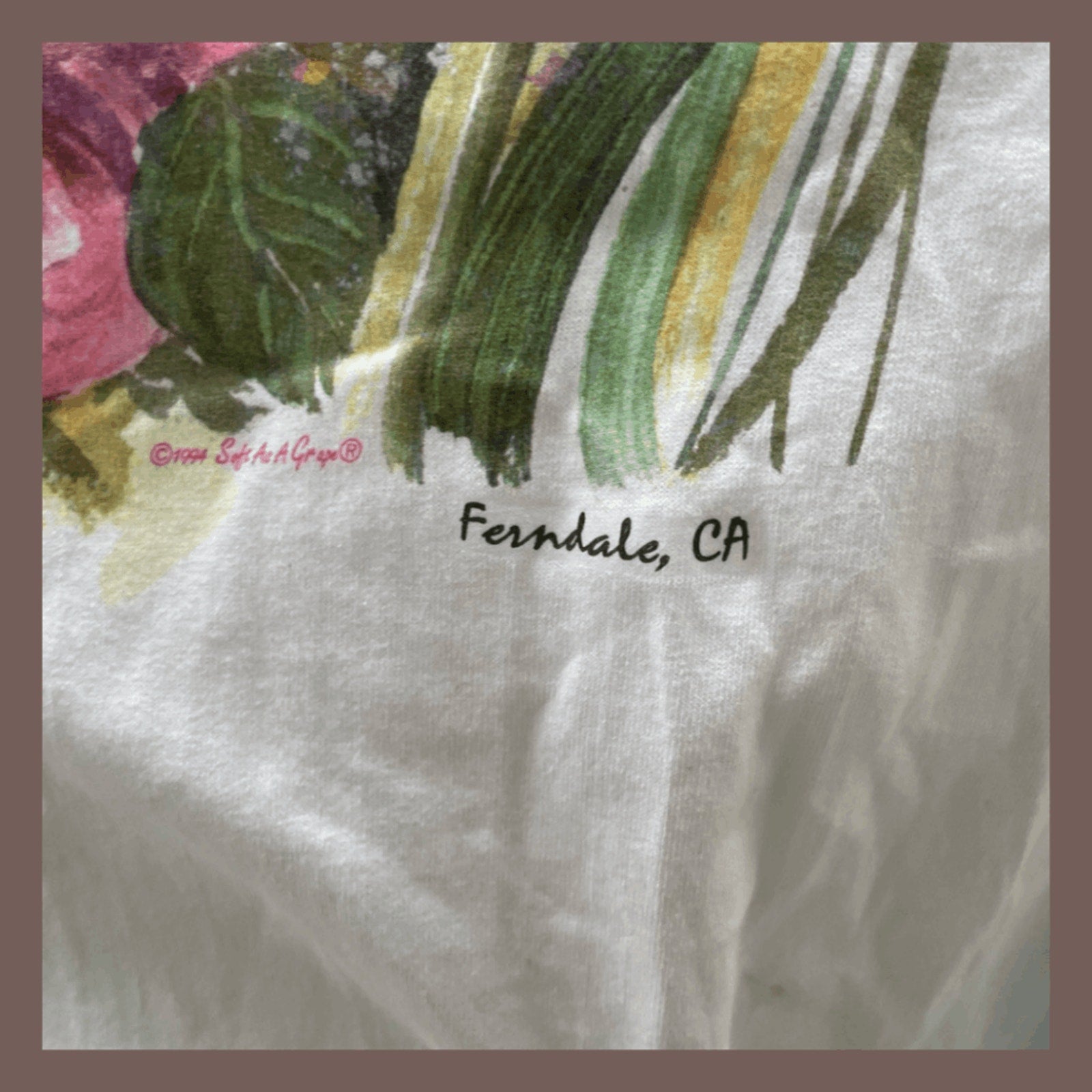 A wearable piece of floral fine art. This rare vintage tee from the Limited Additions collection by Debra Rudderforth features a vivid painterly bouquet across the front and a subtle “Pasadena, CA” detail at the hem. Printed on a soft 100% cotton tee by Grape, this piece is breathable, relaxed in fit, and totally unworn—complete with original tags. An absolute gem for cottagecore collectors and vintage art lovers.