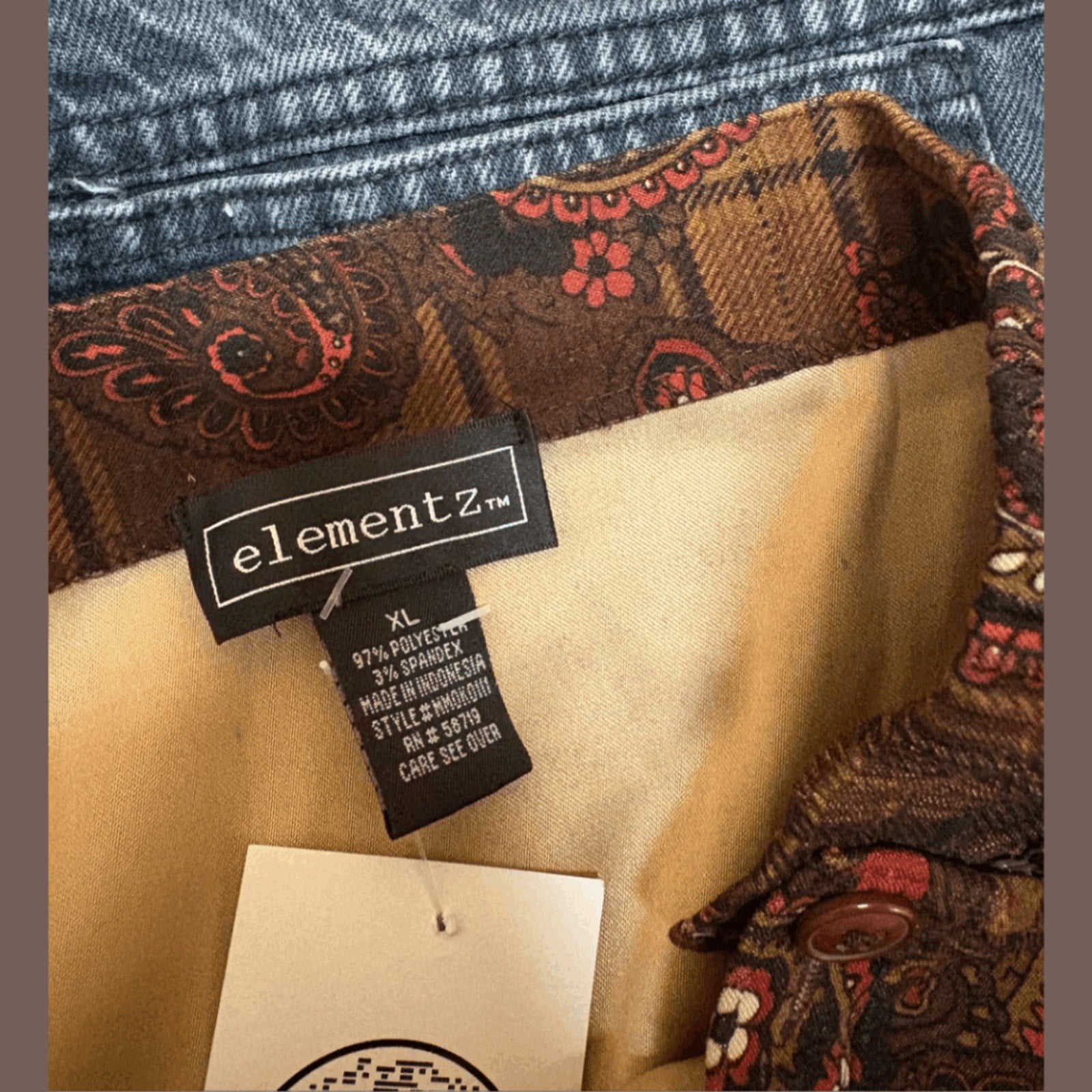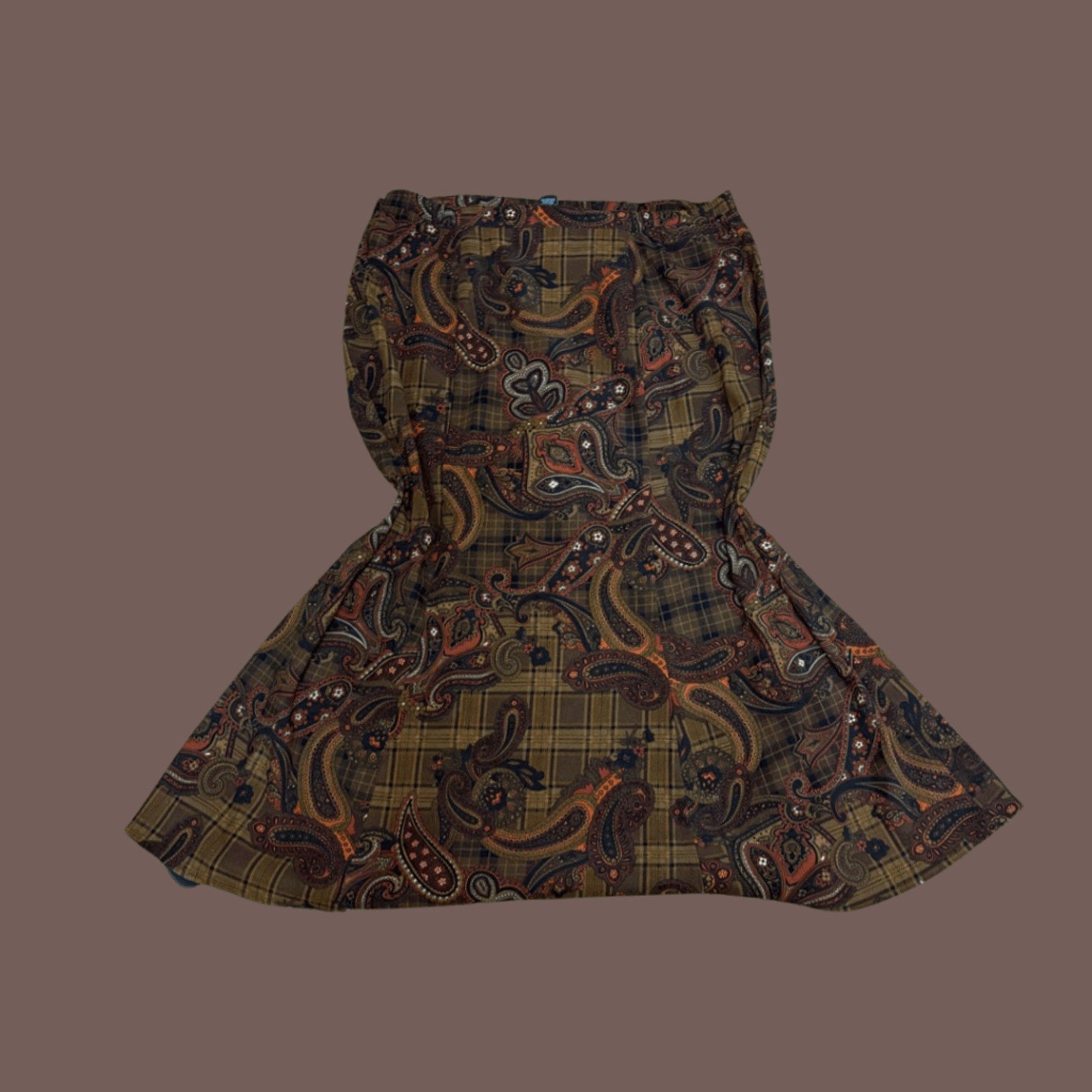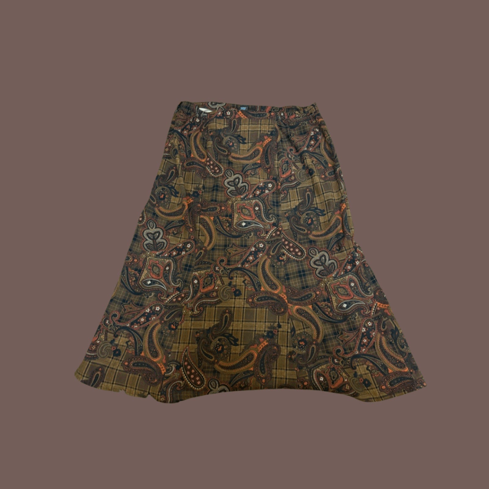 Vintage Elementz A-line midi skirt serving 1970s boho librarian in the chicest way. Features a rich palette of rust, brown, olive, and burnt orange with layered paisley over plaid—basically retro maximalist perfection.