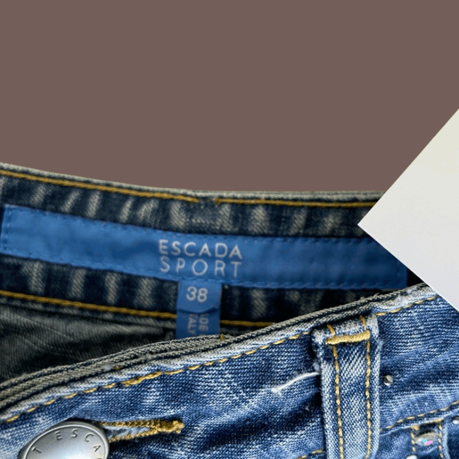Y2K designer sparkle meets festival glam. These ESCADA Sport denim shorts feature an intricate rhinestone starburst design across heavyweight Italian cotton denim. Mid-rise fit with a classic 5-pocket layout and zip fly. The embellished design shimmers in multicolor stones—perfect for summer parties, styled shoots, or standout casual looks. ✧ rhinestone-studded luxury meets Y2K party girl core