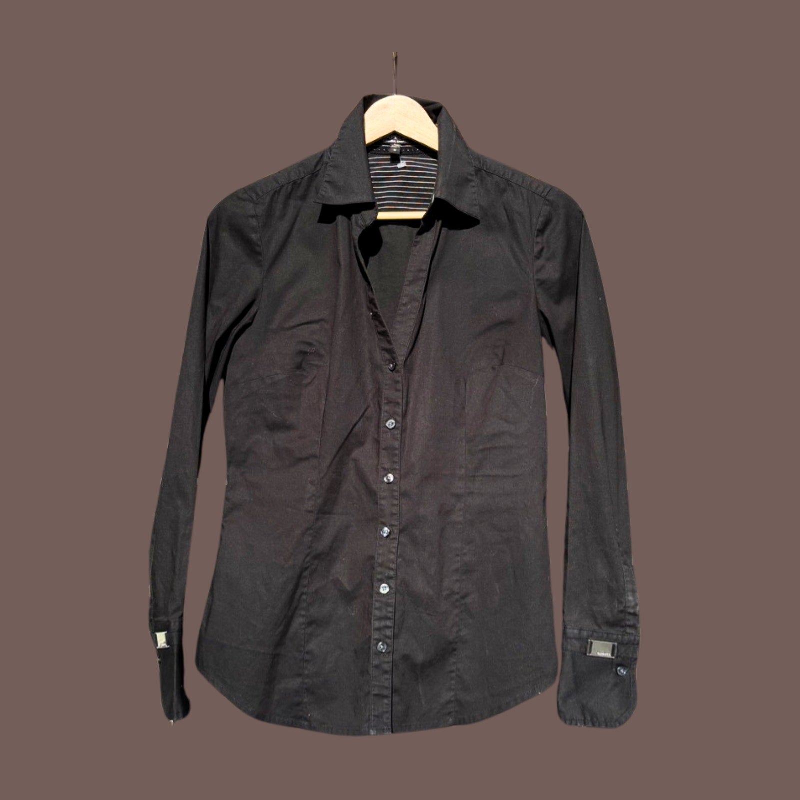 An ultra-sleek staple for any power wardrobe. This fitted Express Essential Stretch button-down is made with a flexible cotton-poly blend for a tailored, curve-hugging silhouette. Classic point collar, minimalist black stretch fabric, and silver logo hardware at the cuffs give it that sharp, office siren edge.