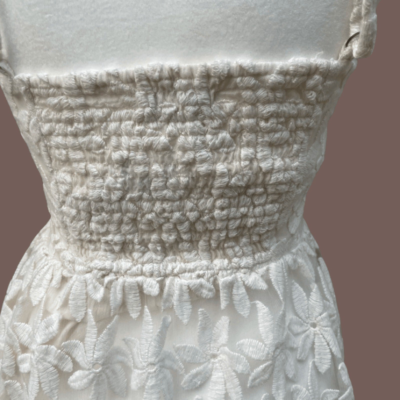 Floaty and ethereal, this Forever 21 dress channels ✧ fairy-tale sunbeam ✧ energy with its daisy-embroidered mesh overlay and flirty sweetheart neckline. Made from a soft cotton blend, it features a smocked back for comfort and a gently flared A-line silhouette. The semi-sheer floral texture layered over a solid lining gives it a dreamy, sun-drenched look—perfect for barefoot brunches, garden hangs, or layering with ballet flats and cardigans.