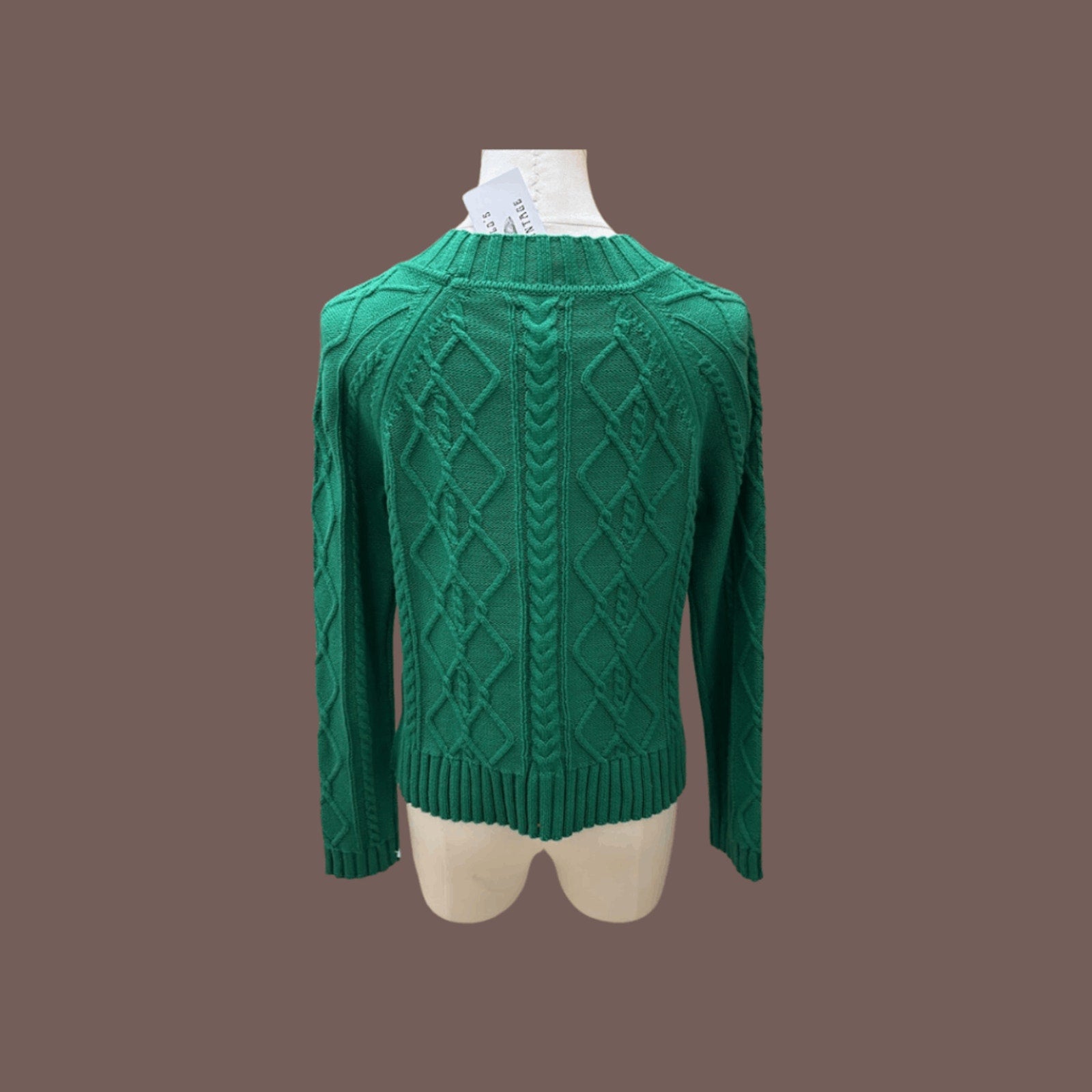 A timeless closet staple—this forest green Gap cable knit sweater is made from 100% cotton for a breathable yet cozy feel. With its crew neckline, classic cable texture, and ribbed trim, this pullover strikes that perfect balance between casual and refined. Easy to layer or wear solo, it’s ✧ green knit perfection for sweater season ✧.