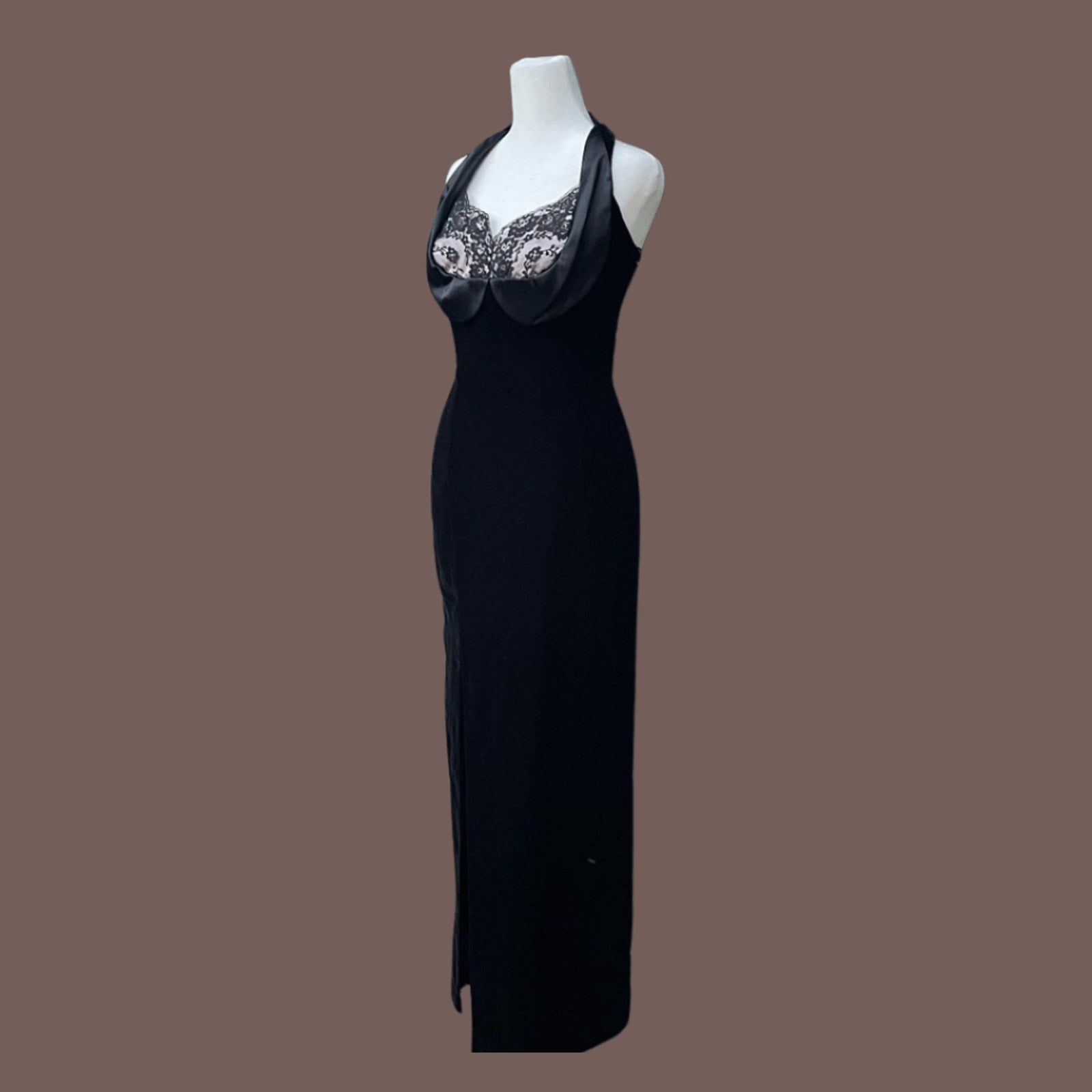 Serving 90s drama with a sultry twist—this vintage Jessica McClintock Gunne Sax bodycon maxi is the ultimate evening stunner. Black halter neckline, sheer lace bust detail with pink underlay, and curve-hugging silhouette bring femme fatale energy with every step. A side slit adds subtle movement while the satin-blend fabric keeps things soft and sleek. ✧ soft glam noir meets prom night nostalgia