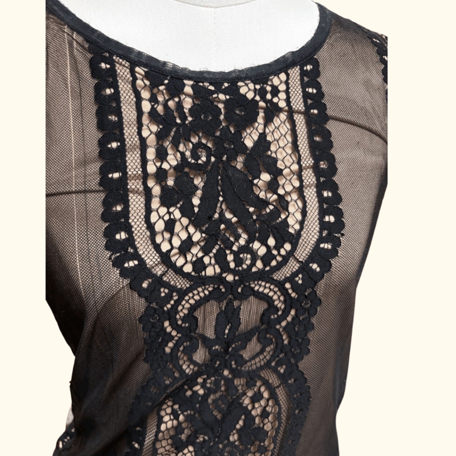 Dark romance meets early aughts glam. This Y2K Max Studio sleeveless tank features intricate black lace over a cream lining, delicate scalloped hem, and back zip closure. The sheer paneling and embroidery create a perfect balance of femme and edgy—ideal for layering over bralettes or under low-rise blazers.
