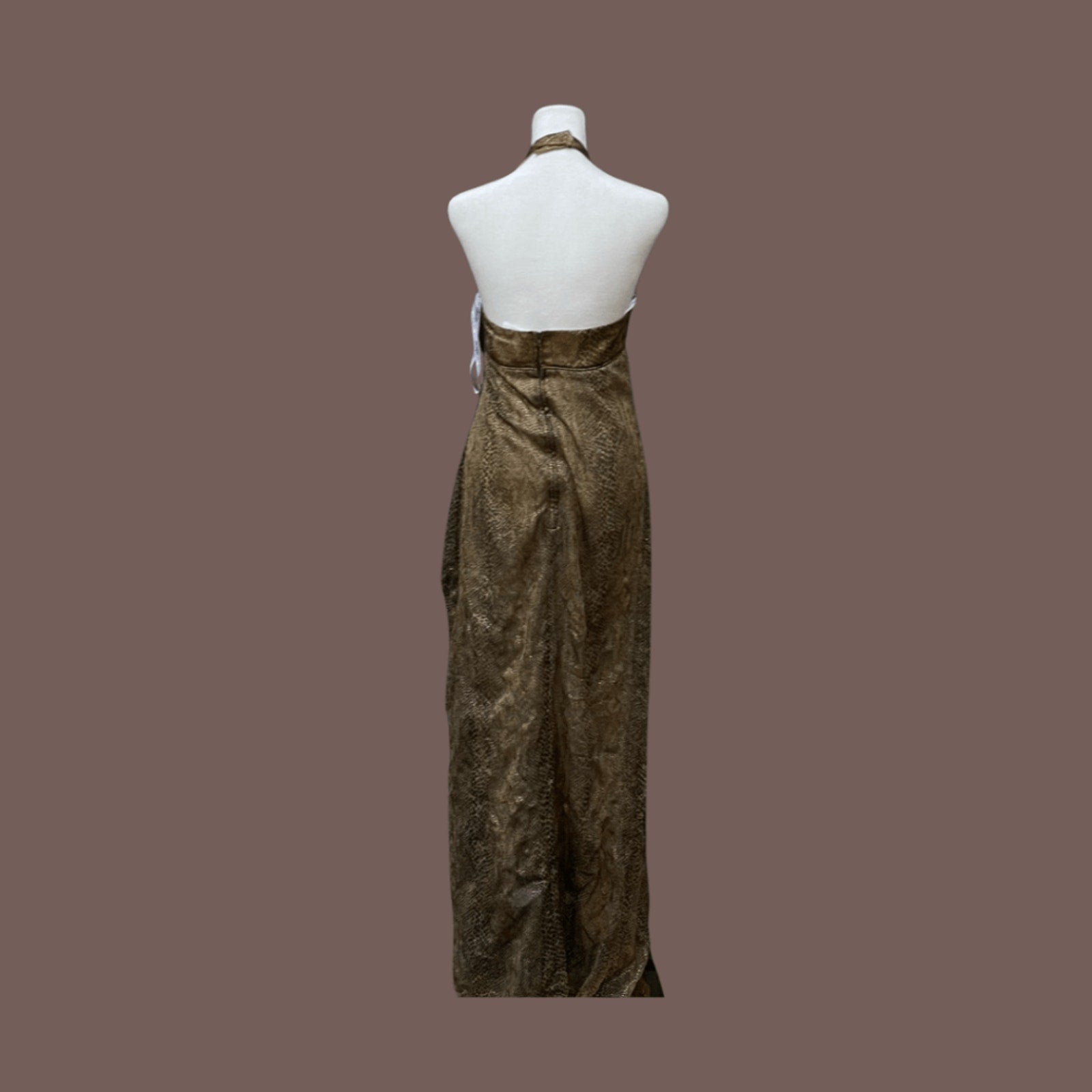 Step into full 80s glam with this vintage halterneck maxi dress by Morgan and Co, designed by Linda Bernell. This sleek, body-skimming silhouette features a shimmering brown metallic animal print, deep scoop neckline, & dramatic halter straps.