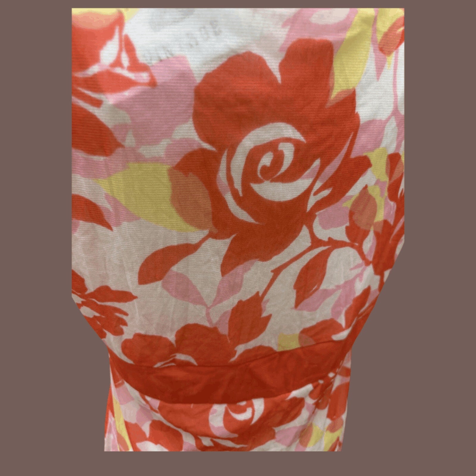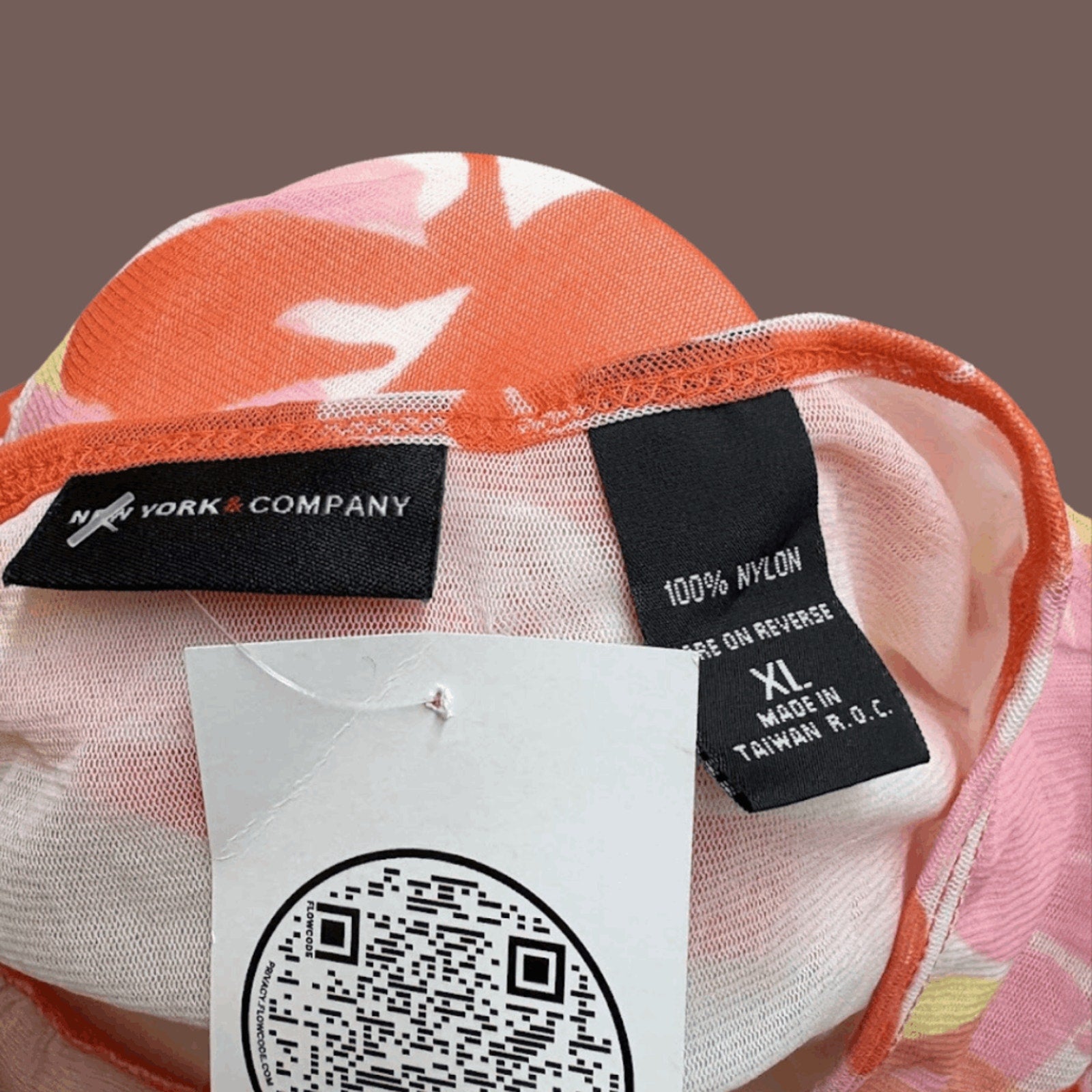 Light‑and‑airy early‑2000s mesh floral top by New York & Company in vibrant coral, pink, yellow and white. The square neckline and empire‑waist silhouette make this a flattering, flowy piece perfect for warm‑weather layering or standalone summer energy. Tagged size XL with measurements listed below.