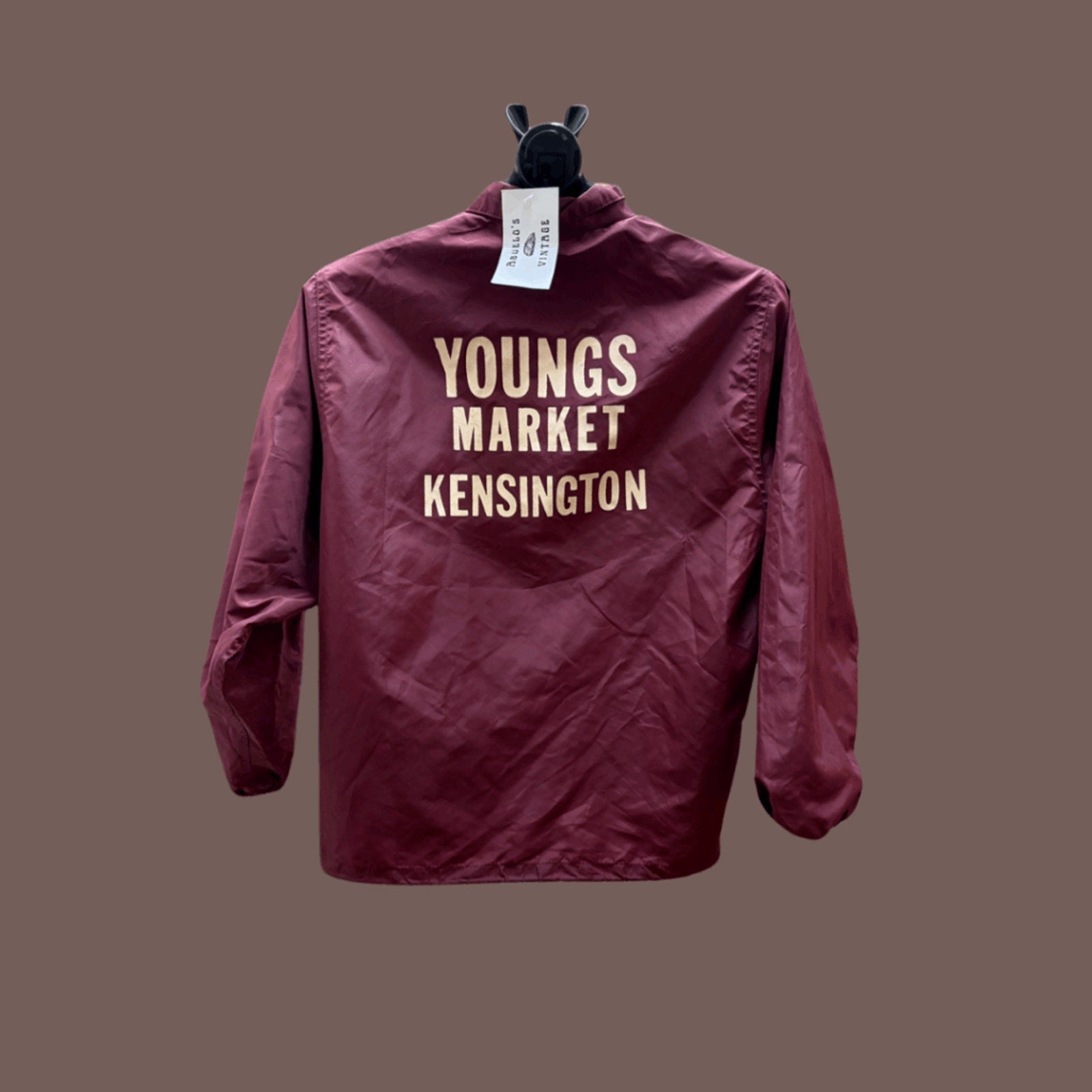 Straight from the dugouts of mid-century California, this 1960s Pla-Jac coach jacket repping El Cerrito Recreation Association brings all the local heritage flair. Features bold white ECRA baseball print on the chest and “Youngs Market Kensington” graphic across the back. Made in the USA with a water-resistant nylon shell, snap-button front, and elastic cuffs. Tagged Large but fits like a modern Small. ✧ hometown hero energy