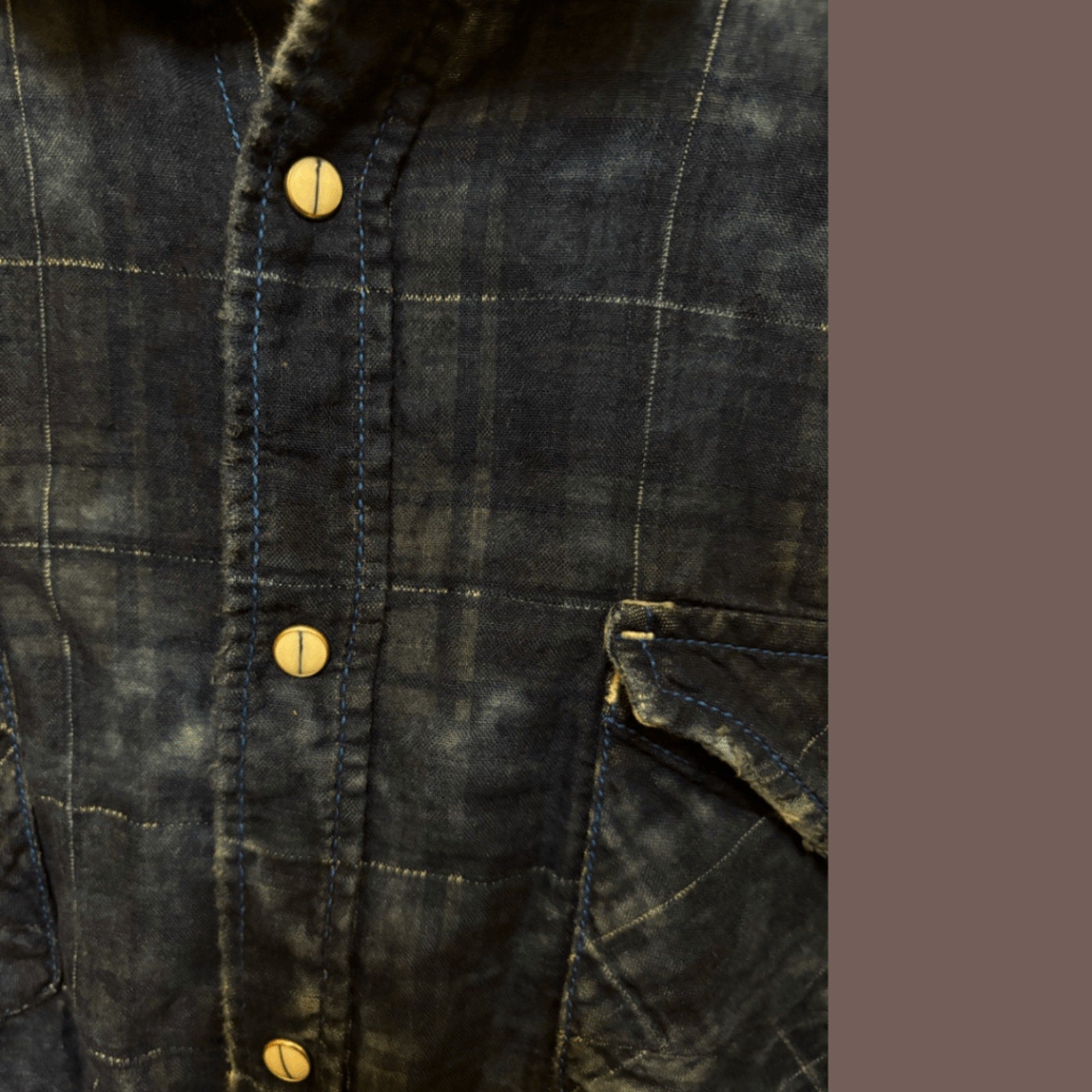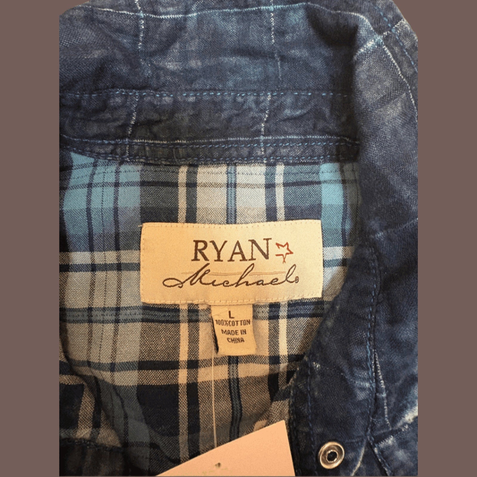 Washed-out rodeo vibes. This Ryan Michael western snap shirt features a deep indigo tie-dye overlay atop a subtle plaid weave—creating a uniquely worn-in look that blends rugged with refined. Western yoke, pearl snaps, and contrast flannel lining give it ✧ quiet cowboy-core ✧ energy.