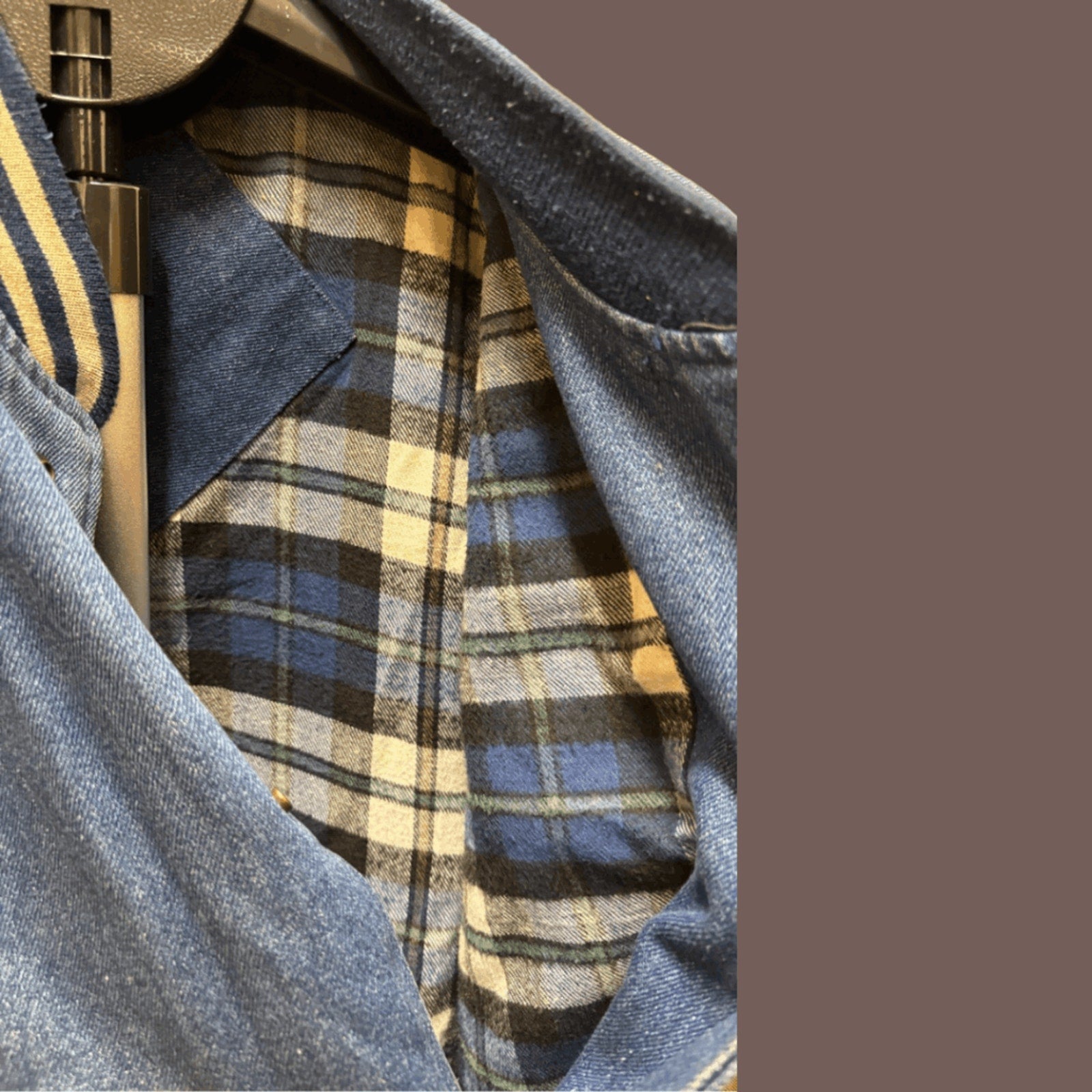Straight from the golden era of theme parks and embroidered merch. This 1990s Six Flags Marine World varsity jacket features a denim body with tan sleeves, plaid lining, and bold dolphin embroidery on the back. Finished with snap buttons, striped ribbed trim, and a front logo hit, it’s peak retro theme park energy. ✧ nostalgic NorCal amusement core