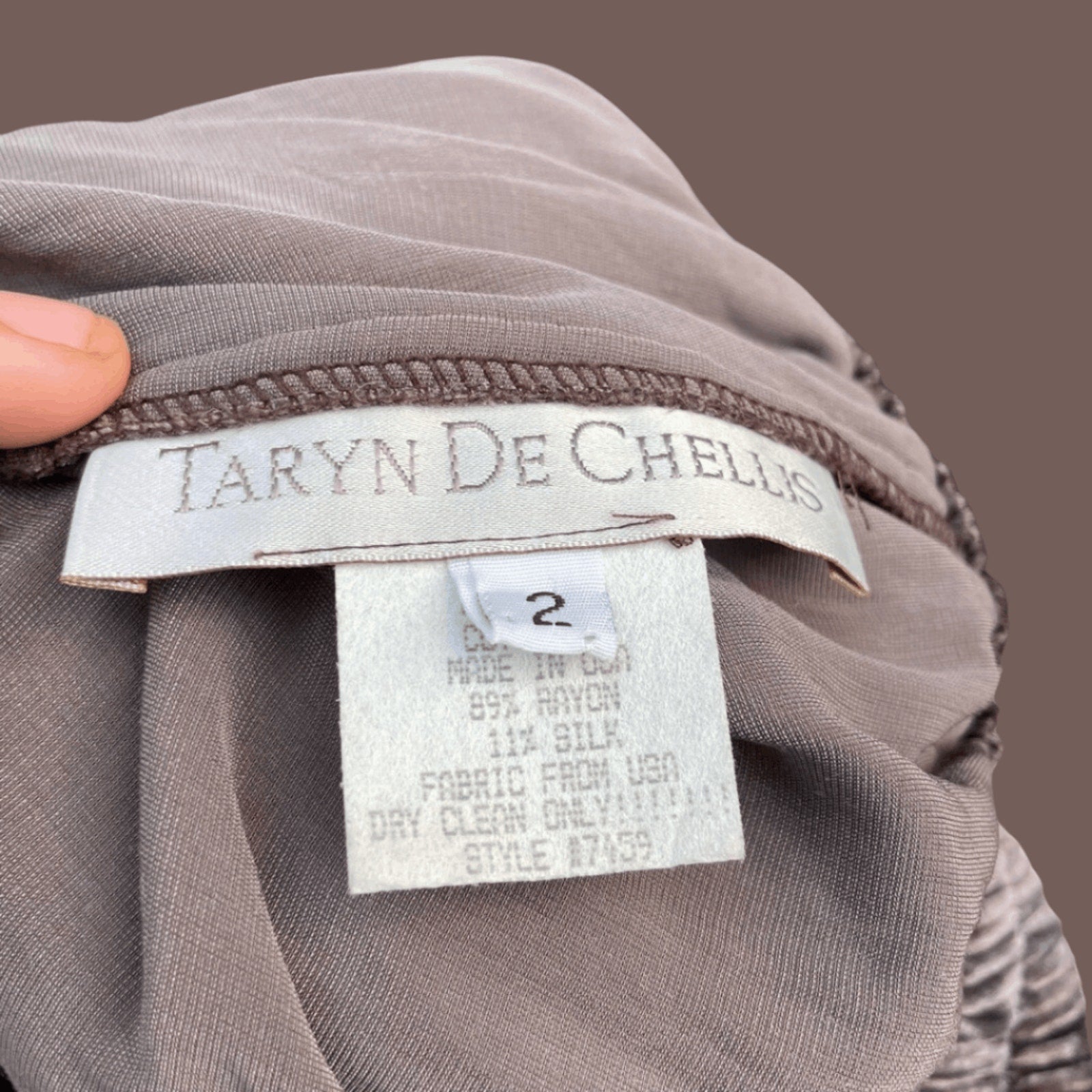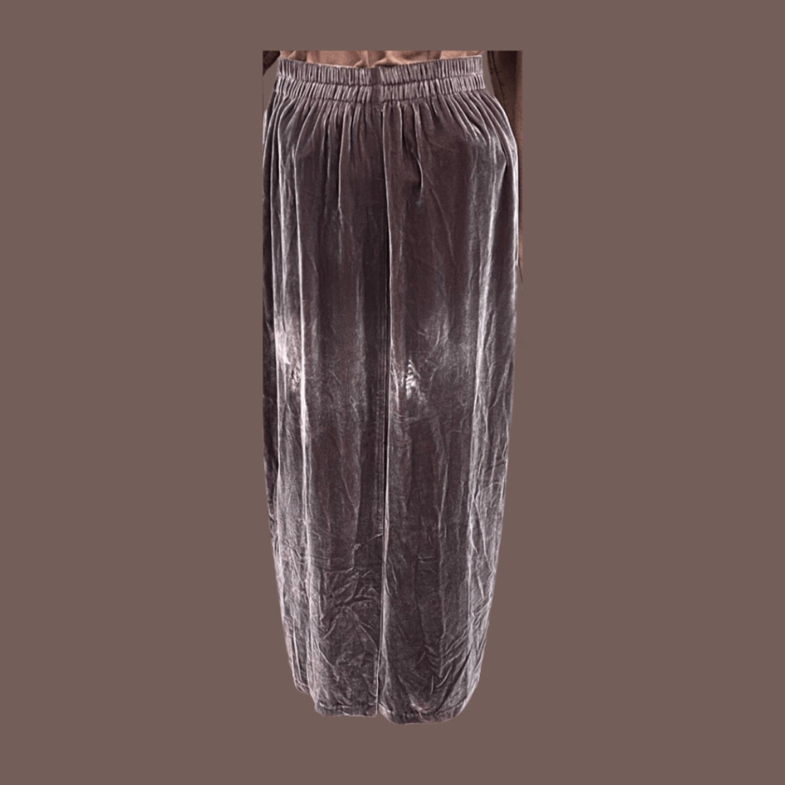 Velour for your villain era. This 90s Taryn De Chellis maxi skirt is dripping in soft, slinky espresso silk-blend drama. Ultra-flowy with a plush sheen and elastic waist that hugs just right—this one floats when you walk. Perfect for dark academia daydreaming, moody art girl layering, or styling with a vintage knit and boots on a gray October morning.