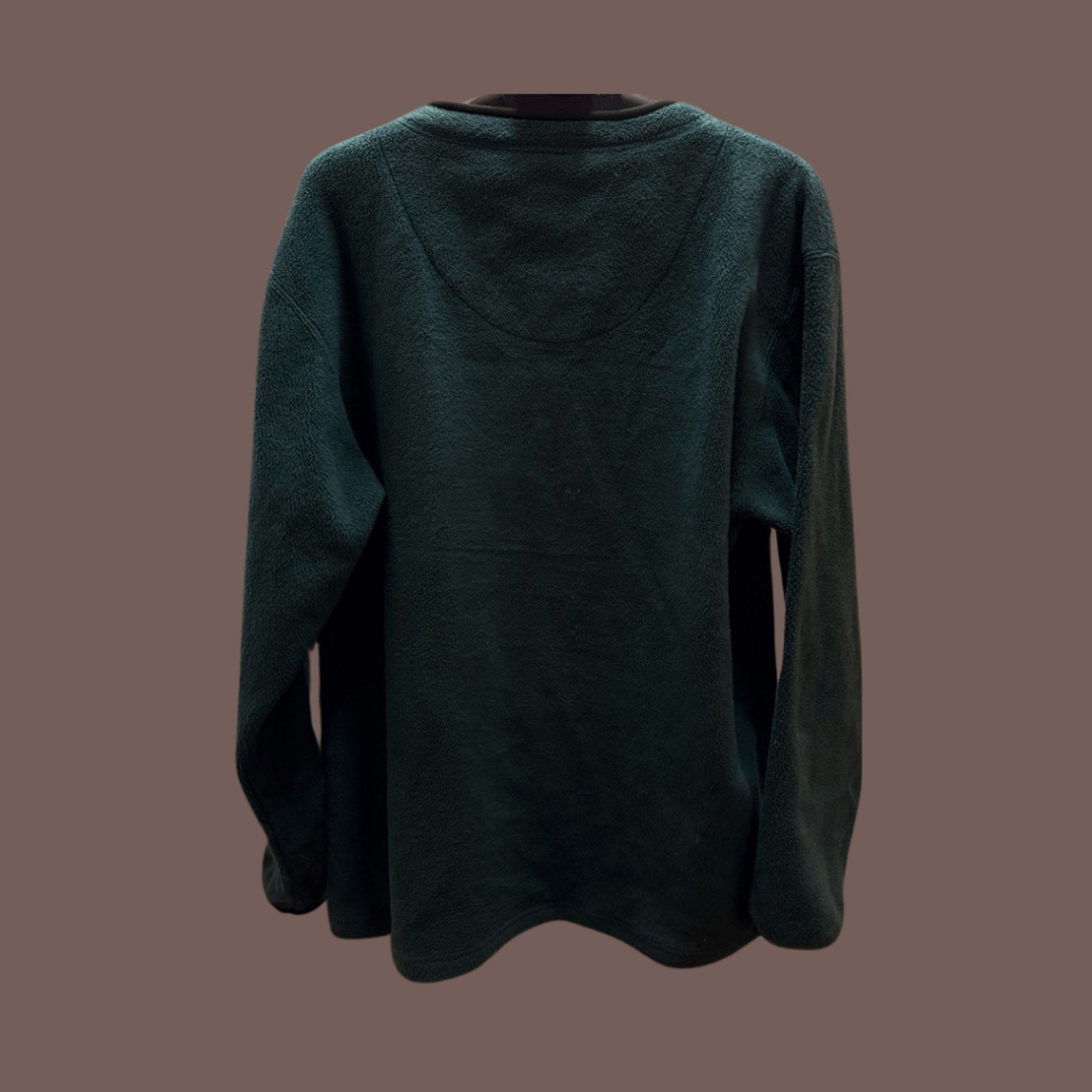 Vintage Tri-Mountain fleece pullover in a deep forest green, featuring an embroidered Golden Gate Fields logo—complete with a retro horse racing motif. Crafted from ultra-soft 100% polyester fleece with a contrast black V-neck lining for a sporty feel. Cozy, durable, and designed for layering—perfect for chilly mornings or racetrack nostalgia.