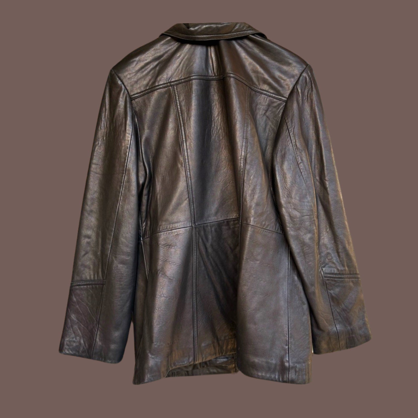 Classic vintage black leather jacket from Wilsons, the leather experts. This piece features paneled vertical seaming, a pointed collar, full button front, and a smooth satin lining. Sleek yet slightly boxy fit gives it that timeless early 2000s edge. A perfect lightweight leather layer for transitional weather—clean, versatile, and gender-neutral in silhouette.